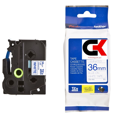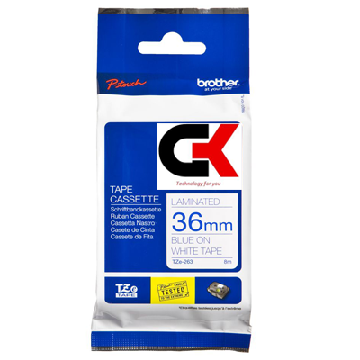 Nhãn in Brother TZE-263, Khổ rộng 36mm, chữ xanh nền trắng (blue on White) bám dính cao