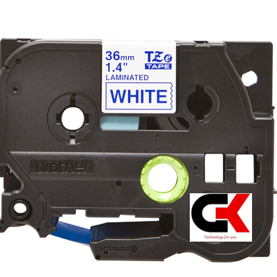 Nhãn in Brother Tze-263 khổ 36mm, chữ xanh nền trắng.