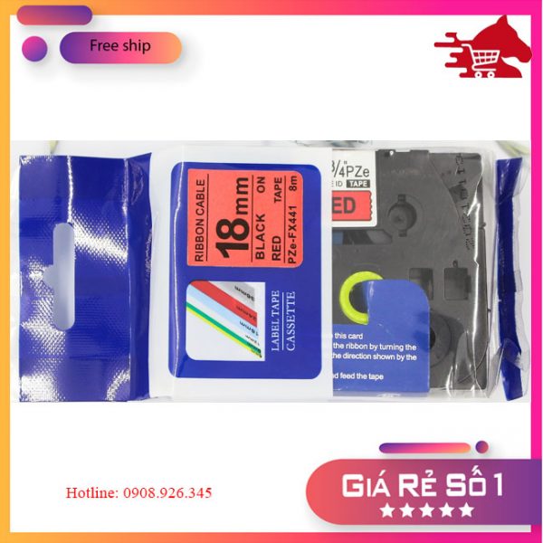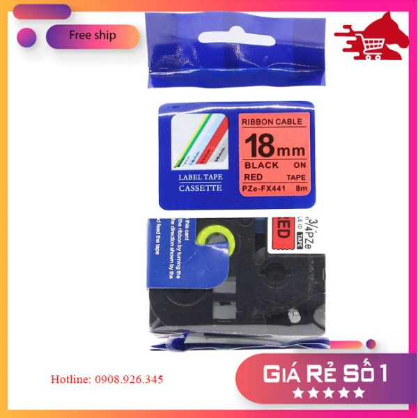 Nhãn in PZE-FX441, chữ đen nền đỏ, khổ rộng 18mm, siêu dẻo.
